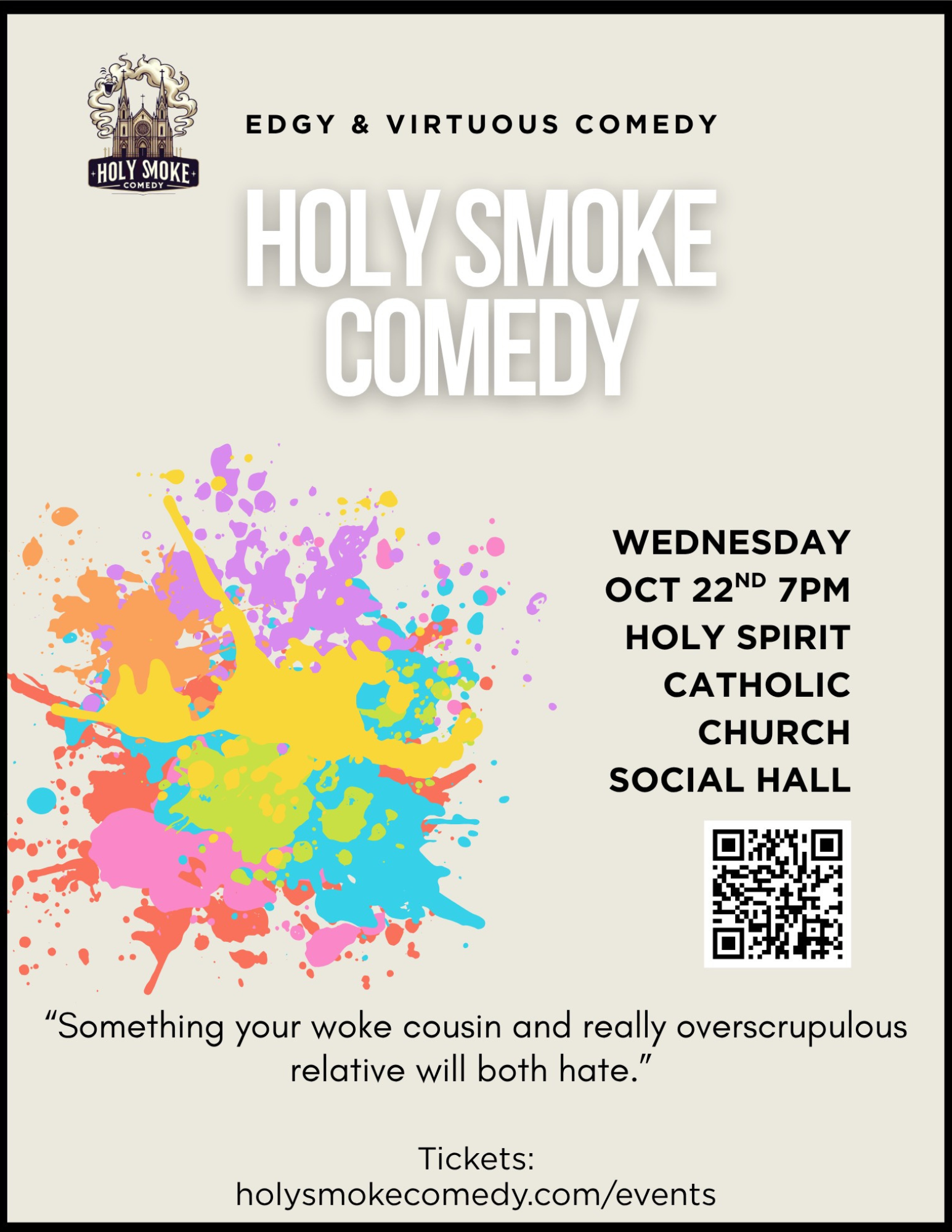 Join Holy Smoke in the mission of not only a super fun night of laughs & humor that has depth and makes you think but also a lasting cultural impact that encourages the good, the true, and the beautiful. We are edgy yet virtuous. Not sure if comedy is the right for for your event? Want something a little more dramatic? Check out our Martyr Mystery Interactive Dinner Theater ™